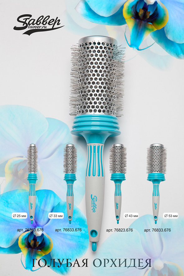 Термобрашинг «Голубая Орхидея» с разделителем прядей, титановым покрытием втулки и нейлоновой щетиной, способной работать при высоких температурах до 260С . Оснащен системой Round Technology, предотвращает повреждение волос клиента и исключает возможность наматывания пряди между ручкой и основанием.