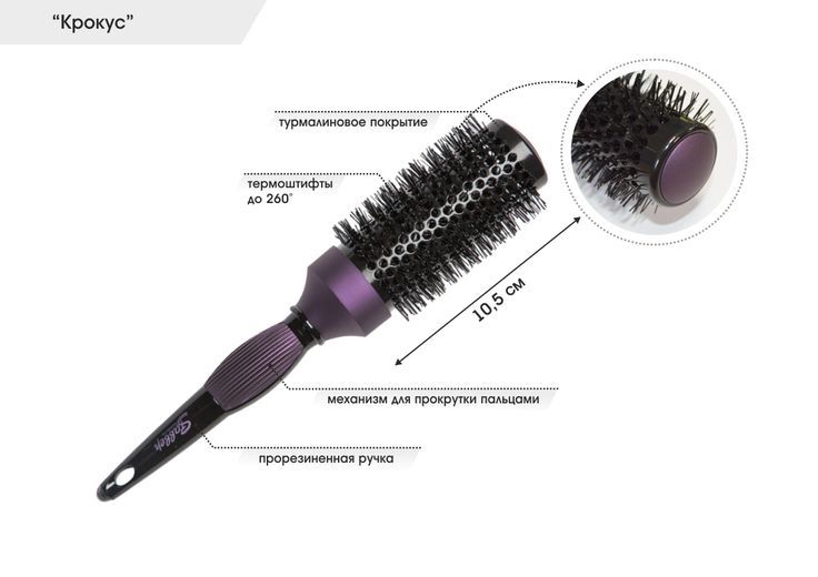 Ручка выполнена из специального прорезиненного материала и имеет идеально эргономичную форму для наибольшего комфорта в использовании. Но более всего термобрашинг коллекции «Крокус» подходит для профессиональных целей, когда требуется бережное отношение к волосу с сохранением температуры, например, для накрутки локонов.