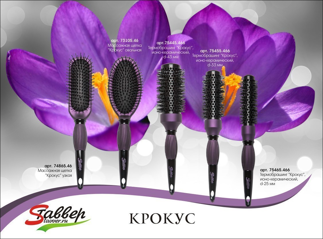 Термобрашинг «Крокус» с турмалиновым покрытием втулки и нейлоновой щетиной, способной работать при высоких температурах до 260С, выделяется среди остальных своим необычным дизайном ручки и цветовым решением.